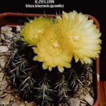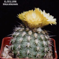 This photo features a wild-collected plant of Coryphantha sulcata, a native cactus of the central and south-central parts of Texas. This plant was collected by me in 1979 in Bell County, Texas, in a portion of the Blackland Prairie ecozone which runs through that part of central Texas. Wild collecting now belongs in another era, back when few people thought twice about collecting wild plants! The photo is of the plant in cultivation with rocks arranged around the pot’s sides to give a more “naturalistic” look. This species is spectacular when in bloom, with bright satiny yellow flowers. It is now fairly widely available in the trade. 14.10.01