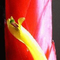 Yellow flowers on a flaming red bract. The red bract lasts for many weeks but flowers only last a day or two. Once flowering has finished the plant goes into a decline and one or two offshoots are produced.